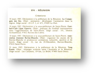 A la Réunion, le premier conseil d’administration de l’association Tang Koala comportait 6 membres : Mme Nicole Cellier, présidente, Mme Le Begat, M Helmsetter, Mme Robert, Mme Berrard et Mme Giraudet. Viendront s’ajouter 3 autres membres cette même année : M Baggioni, M Depré et Mme Fontaine.