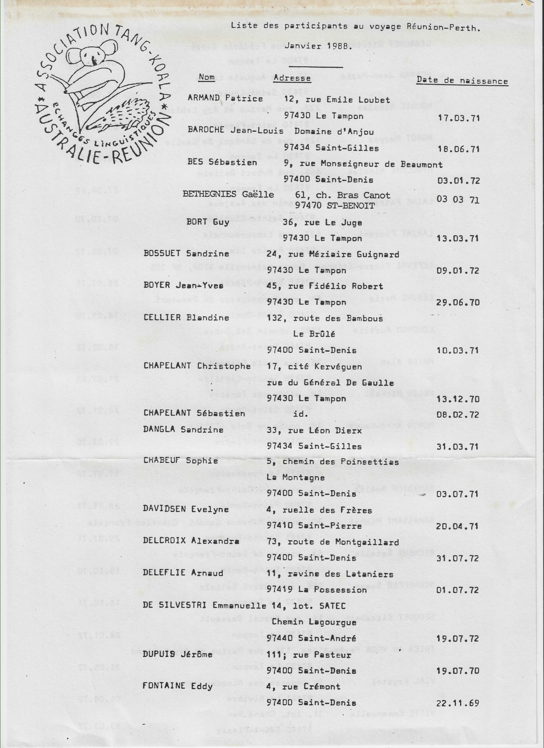 Le premier séjour en Australie Occidentale a eu lieu du 16 décembre 1985 au 28 janvier 1986, soit 5 semaines ! Parmi les 21 jeunes qui en profité, nous disposons des noms de 16 d’entre eux :