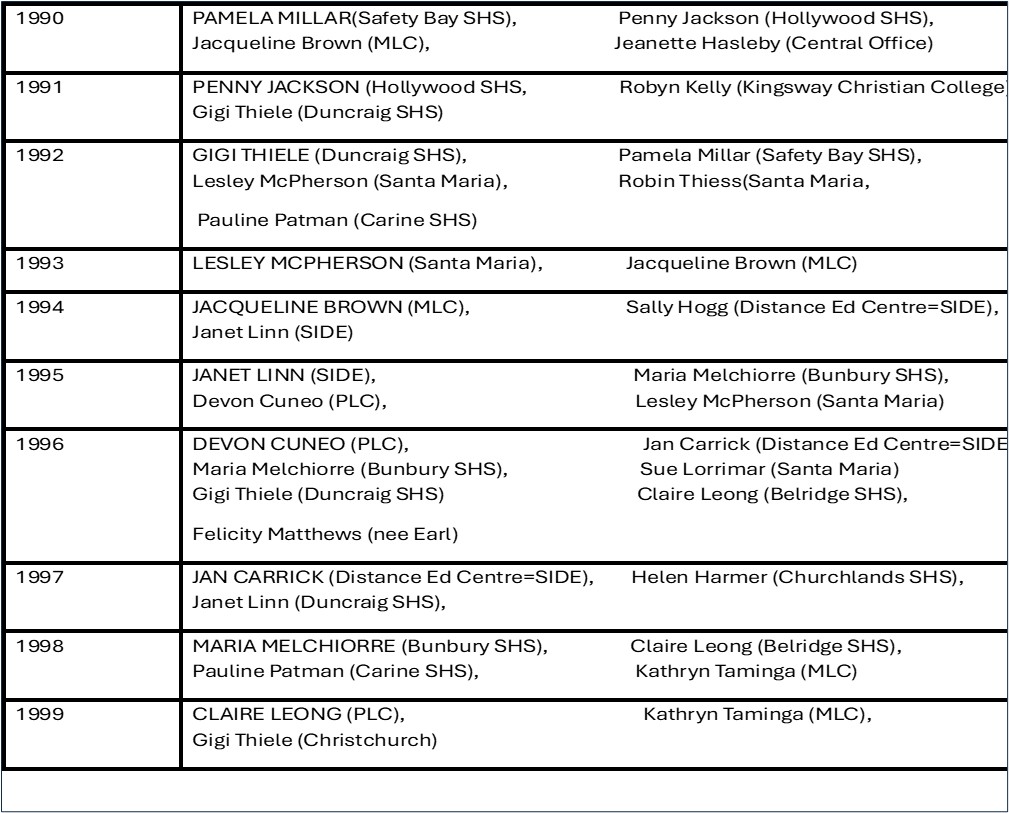 | 1988 | Pauline Patman (Carine SHS), Pamela Millar (Safety Bay SHS) | 30 |