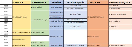 Comme dans toute association, le conseil d’administration de Tang Koala change au gré des départs et des nominations. Comme le montre ce tableau récapitulatif des membres du bureau entre 1985 et 2000, certains membres s’investissent dans la durée, d’autres prennent de nouvelles fonctions, la continuité est assurée et les échanges perdurent.